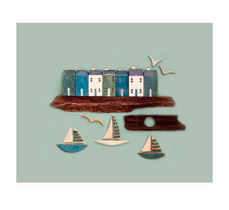 Wooden fishermens’ cottages made by East of India nestle above a harbour with ceramic boats under sail and noisy seagulls.